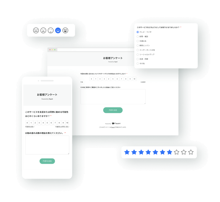 テンプレートで簡単にアンケートが作成可能。回答形式を組み合わせ用途に応じてカスタマイズ。手間なく集計でき、結果の分析もサポート。